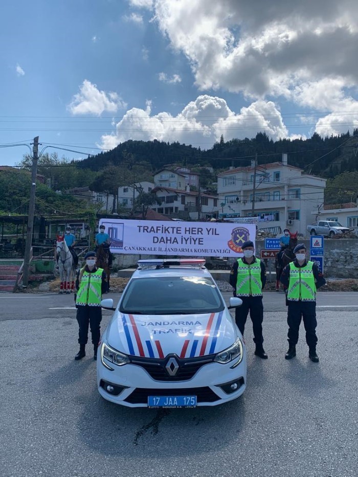 Çanakkale İl Jandarma Komutanlığı sorumluluk bölgesinde “Karayolları Trafik Haftası” Kutlama etkinlikleri yapıldı.“Karayolları Trafik Haftası” etkinlikleri Koronavirüs (Covid-19) salgınına karşı alınan tedbirlerle örtüşecek şekilde yapıldı. Trafik haftası süresince “Evdeyim Ama Trafik Kuralları Aklımda, Trafikte Her Yıl Daha İyiye” mottosu etkin olarak kullanıldı. Bu kapsamda 11.00-13.00 saatleri arasında Çanakkale, Ezine, Bayramiç, Çan, Biga ve Lâpseki İlçelerinde Helikopter ile havadan trafik denetimi yapılmıştır. “Evdeyim Ama Trafik Kuralları Aklımda”, Trafikte Her Yıl Daha İyiye” yazılı Pankartlar hazırlanmış, pazar yerleri ve trafikte görünecek yerlere asılmıştır. Afiş ve Broşürler trafik timleri tarafından yol kontrollerinde sürücülere dağıtıldı. Bilboard görselleri şehrin yaya ve araç trafiğinin yoğun olduğu yol güzergâhlarında ışıklı reklam panolarında sergilendi. “Trafik haftası Logosu” da yapılacak resmi yazışmalar da hafta boyunca kullanılacak. Sokağa çıkamayan çocuklar ile Sevgi evlerinde bulunan çocuklar trafik timleri tarafından evlerinde ve yurtlarında ziyaret ediliyor. Çocukların sosyal medya uygulaması üzerinden “KARAYOLLARI TRAFİK HAFTASI” etkinliğine, fotoğraf ve videolar ile katılımları sağlandı. Çanakkale merkez Küçük Sanayi sitesinde Jandarma ve Emniyet trafik birimlerince 400 işletmeye 20.000 Adet maske ile trafik konularında broşür dağıtımı yapıldı.