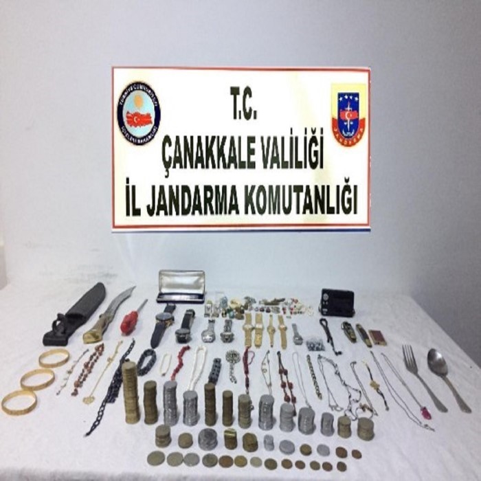 Lapseki ilçesi Çardak beldesinde T.S. isimli şahsın evinde hırsızlık olduğu ihbarı alınması üzerine Lapseki İlçe Jandarma Komutanlığından 2 Asayiş timi görevlendirildi.. Görevlendirilen timler ev ve çevresinde araştırma ve inceleme yaptığı sırada bahse konu evin camının kırılarak evin içerisinden 1 şahsın kaçtığı tespit edildi. Ev ve çevresinde yapılan araştırma sonucunda S.D. isimli şahıs yakalandı. Şahsın kaçmak için evin camını kırdığı esnada kollarında kesik meydana geldiği ve yaralandığı da tespit edildi.. Yaralı olarak yakalanan şüpheli S.D. isimli şahsın yapılan sorgulamasında 2 evden Hırsızlık ve 5 Kasten yaralama suçundan ceza aldığı tespit edilmiştir. Şüpheli şahsın yapılan tedavisine müteakip yer göstermesi sonucunda 1 Adet Kasatura bıçak, 1 Adet Tornavida, 9 Adet Kol saati, 1 Adet Kamera, 1 Adet Çakı, 1 Adet Tesbih, 3 Adet Altın Bilezik, 15 Adet Altın kolye, 4 Adet yüzük, 2 Adet Kol düğmesi, 14 Adet Metal bileklik, 65 Adet Eski100 TL, 28 Adet eski 500 TL, 20 adet eski 5.000 TL, 26 Adet eski 10.000 TL. 14 Adet eski 10 TL, 12 Adet eski 2,5 TL, 14 Adet eski 25 Kuruş, 7 Adet eski 25.000 TL, 4 Adet eski 1.000 TL, 3 Adet eski PTT Jetonu, 3 Adet İETT Jetonu, 1 Adet 20 Sent ele geçirilmiştir. Şüpheli S.D isimli şahıs Adli makamlarca tutuklandı.