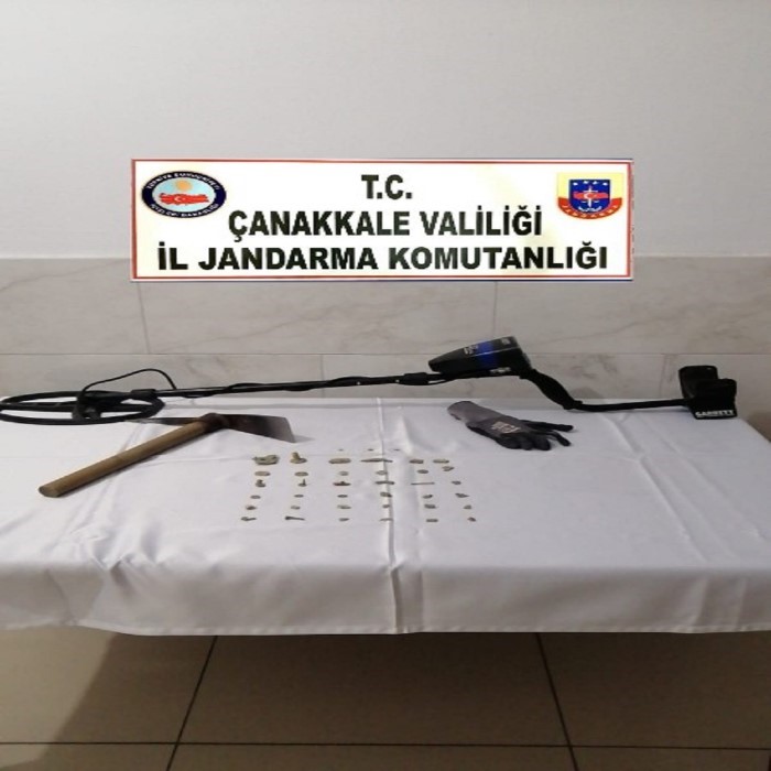 Çanakkale İl Jandarma Komutanlığı ekiplerince, Çanakkale merkeze bağlı Erenköy(İntepe) köyü Karanlık Liman mevkiinde Önleyici Kolluk Devriyesi icra edilirken izinsiz kazı yapıldığı tespit edildi. Define avcılarının bölgede izinsiz kazı yaptığı esnada, N.H.U isimli şahıs devriye ekiplerini fark ederek dur ihtarına uymayarak kaçmaya çalıştı. Jandarma ekipleri N.H.U isimli şahıs yakaladı. Şahsın yapılan üst aramasında 39 adet Sikke ve farklı cinste metaller ve olayda kullanılan 1 adet metal detektör ele geçirildi. Meydana gelen olay ile ilgili 1 adet metal detektör Cumhuriyet Savcılığına , 9 adet Sikke ve farklı cinsten metaller Müze Müdürlüğüne teslim edilmek için muhafaza altına alındı. Şüpheli N.H.U isimli şahıs ifadesinin alınmasına müteakip serbest bırakıldı.