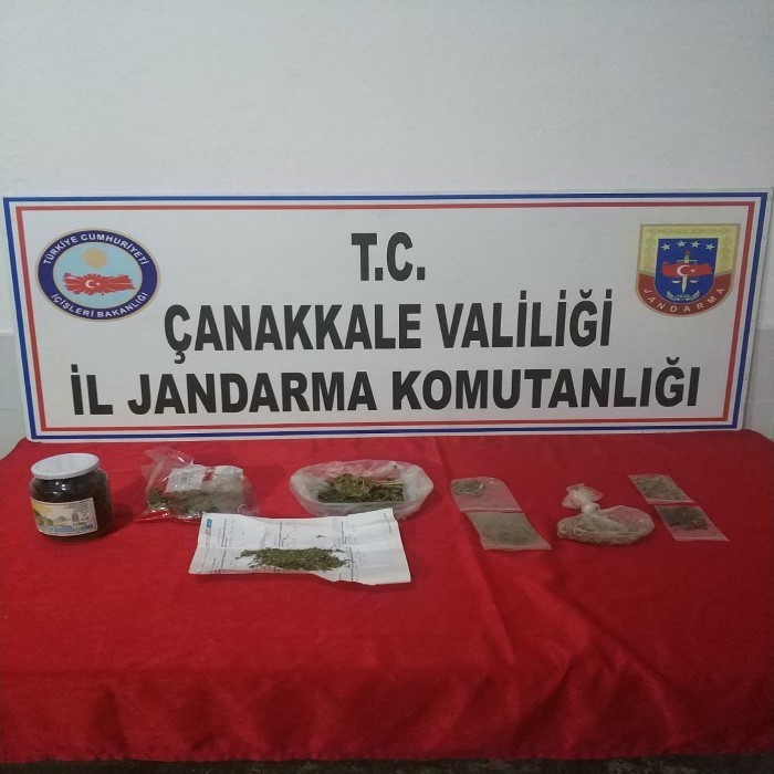 Çanakkale İl Jandarma Komutanlığı KOM Şube Müdürlüğü ile koordineli olarak yürütülen istihbarat çalışmalar sonucu, Biga ilçesi Selvi köyünde bir adreste, kozçeşme köyünde iki adreste olmak üzere üç ayrı adreste uyuşturucu madde arama köpeği ROKET’ in katılımıyla arama yapıldı. Üç ayrı adreste yapılan aramalarda; 146 gr esrar maddesi, 94 gr kenevir tohumu ve 2 adet esrar içiminde kullanılan aparat ele geçirildi. Adli makamların talimatı gereği, 146 gr esrar maddesi, 94 gr kenevir tohumu ve 2 adet esrar içiminde kullanılan aparat el konudu. Adli makamların talimatı ile, A.B. , A.A. ve S.T. isimli şahıslar gözaltına alındı.