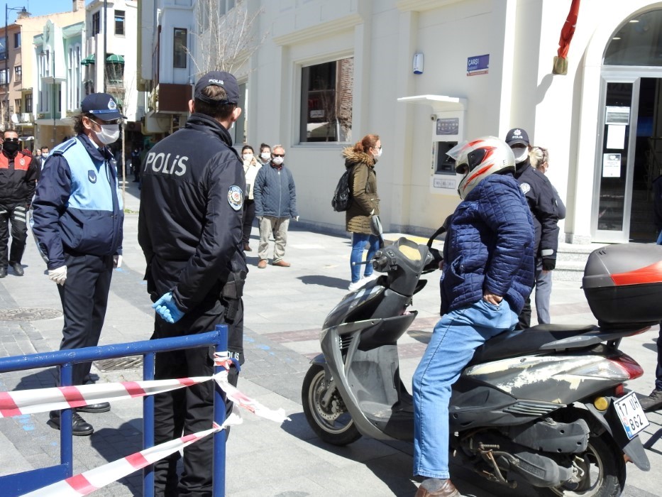 Coronavirüs salgınının daha fazla yayılmaması için alınan tedbirlere her geçen gün bir yenisi ekleniyor. Coronavirüs’ ün yayılmaması için son olarak alınan, 20 yaş altı vatandaşların sokağa çıkma kısıtlaması, vatandaşların toplu bulunulması mecburi olan alanlarda maske takılması ve sosyal mesafe uygulaması tedbirleri denetlenmeye başlandı. Alınan tedbirlere uyuyup uyulmadığı Çanakkale’ de çarşı caddesi bankalar mevkiinde polis ve zabıta kuvvetlerinin çalışması ile denetlendi. Denetlemede vatandaşların kimlik kontrolu yapılarak sokağa çıkma kısıtlaması bulunan yaş grubunda olup olmadıkları kontrol edildi. Ayrıca banka işlemleri için bankalar mevkiine gelen vatandaşların sosyal mesafe kuralına uyup uymadıkları kontrol edildi uyulmayan tedbir kuralları ile ilgili vatandaşlar tekrar tekrar uyarıldı. Gün boyu süren Coronavirüs salgını tedbirleri uygulamasında Çanakkalelilerin maskeli olarak dışarı çıktıkları, sosyal mesafe kuralına uydukları ve yas kısıtlamasında olan vatandaşların alınan tedbirlere uydukları gözlendi.