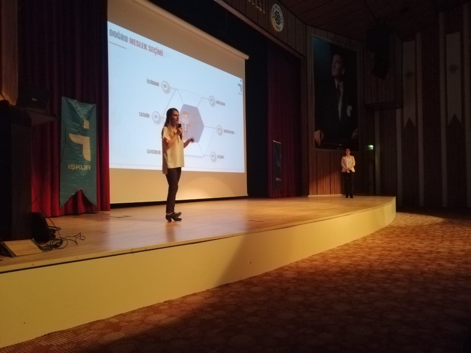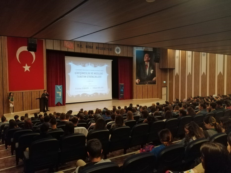 İŞKUR Biga Hizmet Merkezi tarafından Biga Hamdibey Mesleki ve Teknik Anadolu Lisesi öğrencilerine düzenlenen eğitim büyük ilgi gördü. Biga İŞKUR İş ve Meslek Danışmanları Hilal ASLAN ve Emine ERSOY tarafından verilen Meslek Seçimi ve İş Arama Becerileri konulu eğitim, 15.10.2019 tarihinde Atatürk Kültür Merkezi’nde yapıldı. Yaklaşık bir saat süren eğitim Muhasebe ve Finansman, Pazarlama ve Perakende ve Büro Yönetimi bölümlerinde okuyan 360 öğrencinin katılımıyla tamamlandı.