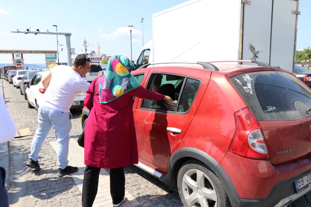 Feribot kuyruğundaki araçlara su dağıtıp Binali Yıldırım'a oy istediler.