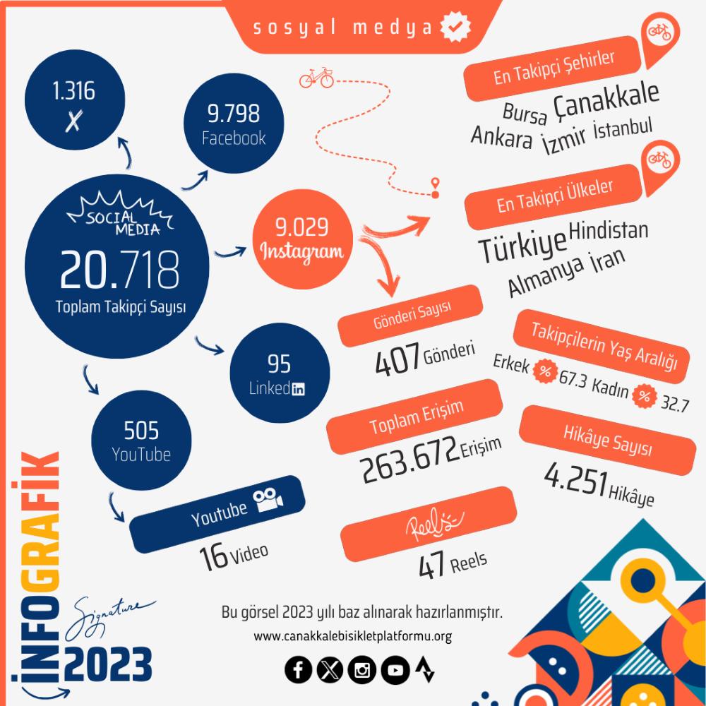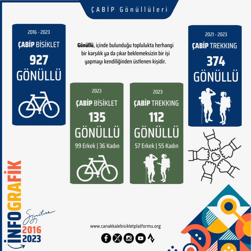 Çanakkale Bisiklet Platformu 17 Ekim 2016 tarihinde Çanakkale’de bisiklet kültürünün yerleşmesini, bisikletli ulaşımı yaygınlaştırmayı, kentte yaşayan tüm bisikletçilerin ortak bir sesi olmasını, kentteki bisiklet gruplarının birlikte çalışabilirliğini, ortak etkinlikler düzenleyebilmesini, şehir içi ulaşımını bisikletle gerçekleştirenlere ve spor-hobi kullanıcılarına daha sağlıklı kullanım alanları oluşturulması için kamu kurumları ile belediye ulaşım politikasında bisiklete önem vermelerini sağlamayı amaçlayarak Kurulan Çanakkale Bisiklet Platformu bir süre önce 7. Kuruluş yıldönümünü kutlamıştı. Çanakkale bisiklet Platformu 2023 yılının son günlerinde Platformun internet sitesi ve sosyal medya sayfaları ile ilgili kuruluğundan buyana gerçekleşen istatistikleri açıkladı. Çanakkale Bisiklet Platformu 2016 – 2023 yılları arasında ve 2023 özelinde gerçekleştirilen sosyal medya, web sitesi, etkinlik istatistiklerini ve gönüllü sayılarının sayısal verilerini paylaştı. Platformun Sosyal medya takipçi sayısı 20.718’e yükseldi. Platformun sosyal medyasında Facebook’ ta 9.798, Instagram’ da 9.029, Linkedin’ de 95 ve Youtube’ de 505 takipçisi bulunuyor. ÇABİP’i internet sitesi ve sosyal medya hesaplarından takip eden takipçilerin yaşadığı şehirler ise başta Çanakkale olmak üzere Ankara, İstanbul, İzmir, Bursa. En takipçi ülkeler ise Türkiye, Almanya, İran ve Hindistan. Takipcilerin %67 Erkek, %33’ü ise kadın. Bu takipçiler ÇABİP’in sosyal medya içeriklerine toplam 263.672 erişim sağladı. Platformun internet sitesinde 2023 yılı en çok görüntülenen haber “12. Çanakkale Bisiklet Turu Şehitlere Saygı sürüşü “ haberini oldu. bu haberi 16.413 takipçi görüntüledi. Platform 2016 – 2023 yılları arasında gerçekleştirdiği etkinliklerde toplam 65 faaliyet gerçekleştirildi. Bu faaliyetler 3.453 katılımcı ile gerçekleştirildi. Faaliyetlerde toplam 1.746 kilometre pedallandı. 52 bisiklet turu, 6 doğa yürüyüşü, organize edildi. Kuruluğundan bugüne ÇABİP’ in gönüllü sayısı 927’ye yükseldi. ÇABİP Trekkıng gönüllülerinin sayısı ise 374 oldu. Sayılardan da anlaşıldığı gibi Çanakkale’nin Bisiklet ve trekkıng buluşma noktası ÇABİP her geçen gün büyümeye devam ediyor.